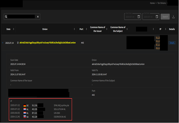 Figure 4. Identified AKIRA's infratructures by OASIS Security's Darkweb Intelligence service, Arthur