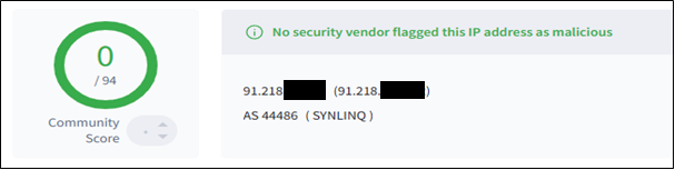 Figure 7. VirusTotal result showing no detections for 91.218.***.***