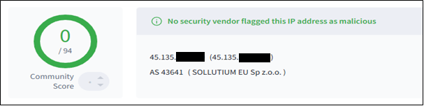 Figure 8. VirusTotal result showing no detections for 45.135.***.***